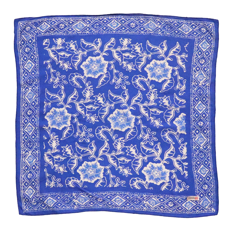 This lovely blue floral patterned scarf is made from white cotton fabric that is then hand-stamped and hand-dyed using 700 years old batik wax and dye technique. The batik fabric is also then sun baked. You should expect some variation of the color.