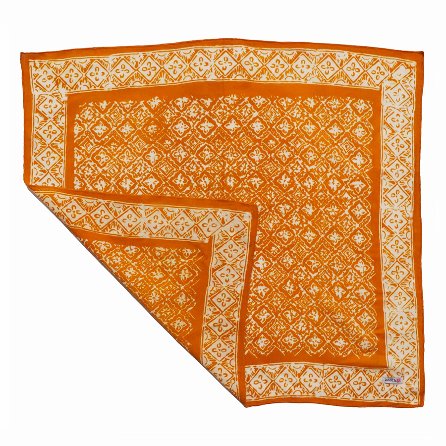 This lovely deep orange patterned scarf is made from white cotton fabric that is then hand-stamped and hand-dyed using 700 years old batik wax and dye technique. The batik fabric is also then sun baked. You should expect some variation of the color.