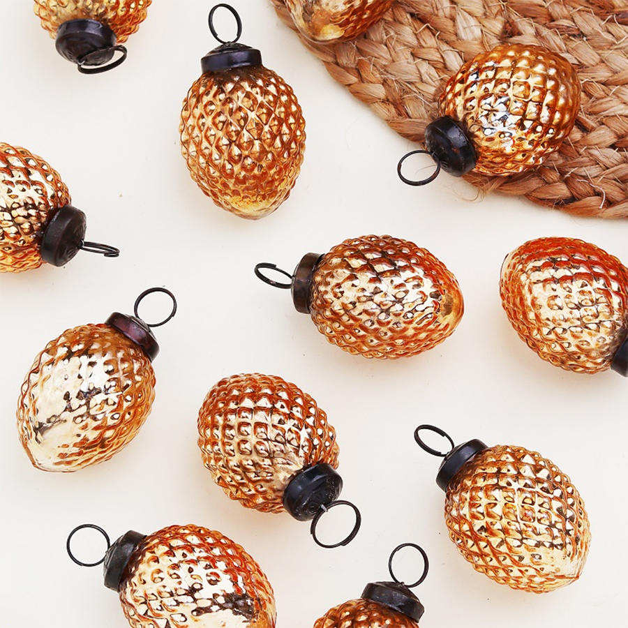 A beautiful copper pinecone glass ornament.
