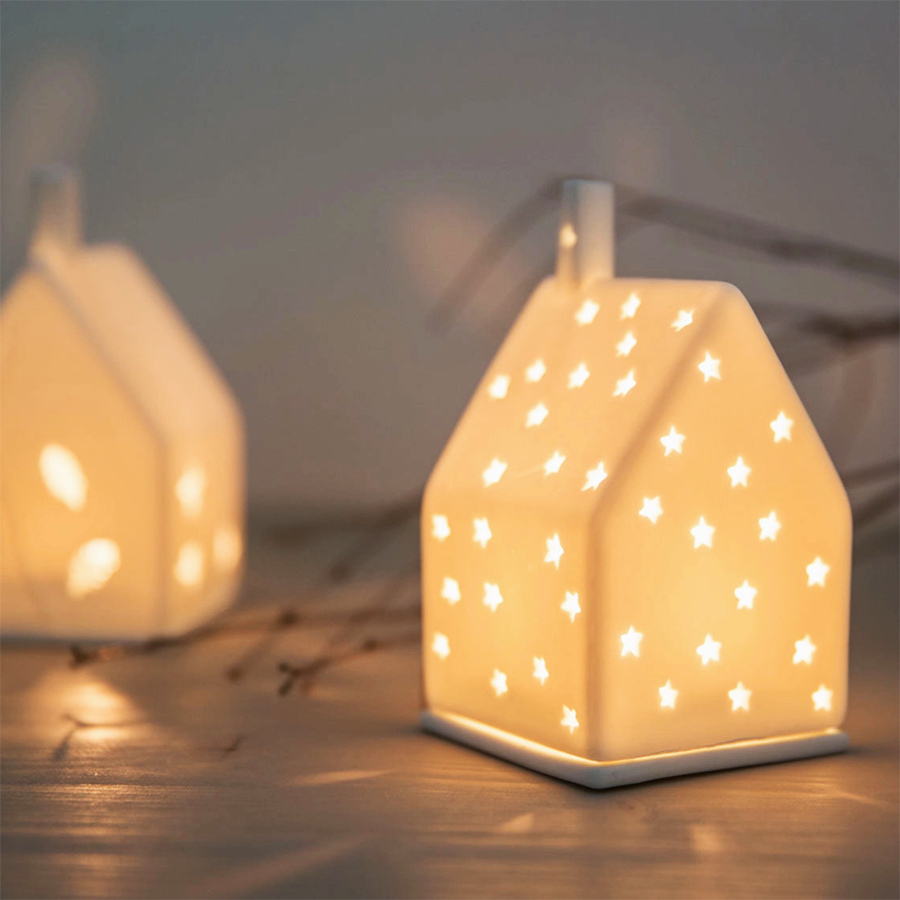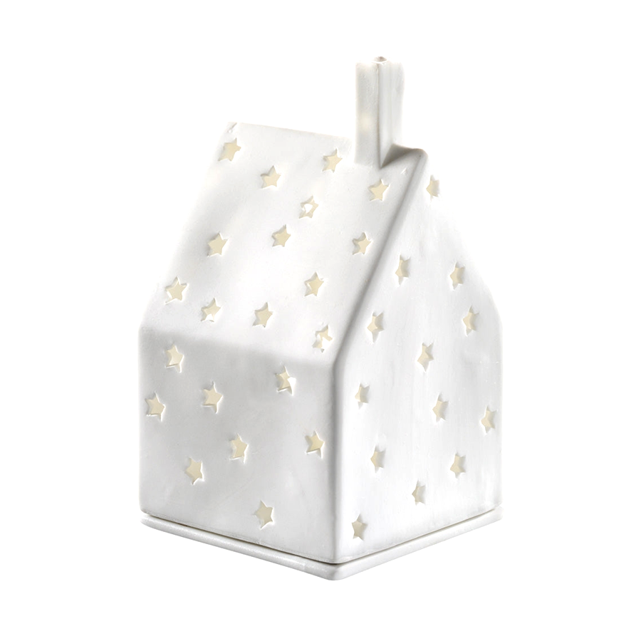 This stunning Village House with Stars is a small tealight house made of the finest porcelain that presents the magic of a starry sky and invites you to dream. This product is handcrafted with care. A galaxy full of detailed star cutouts let the light source shine through. This starlit cottage can be a source of light for your beautiful village. Beautiful house sits atop a porcelain base plate.