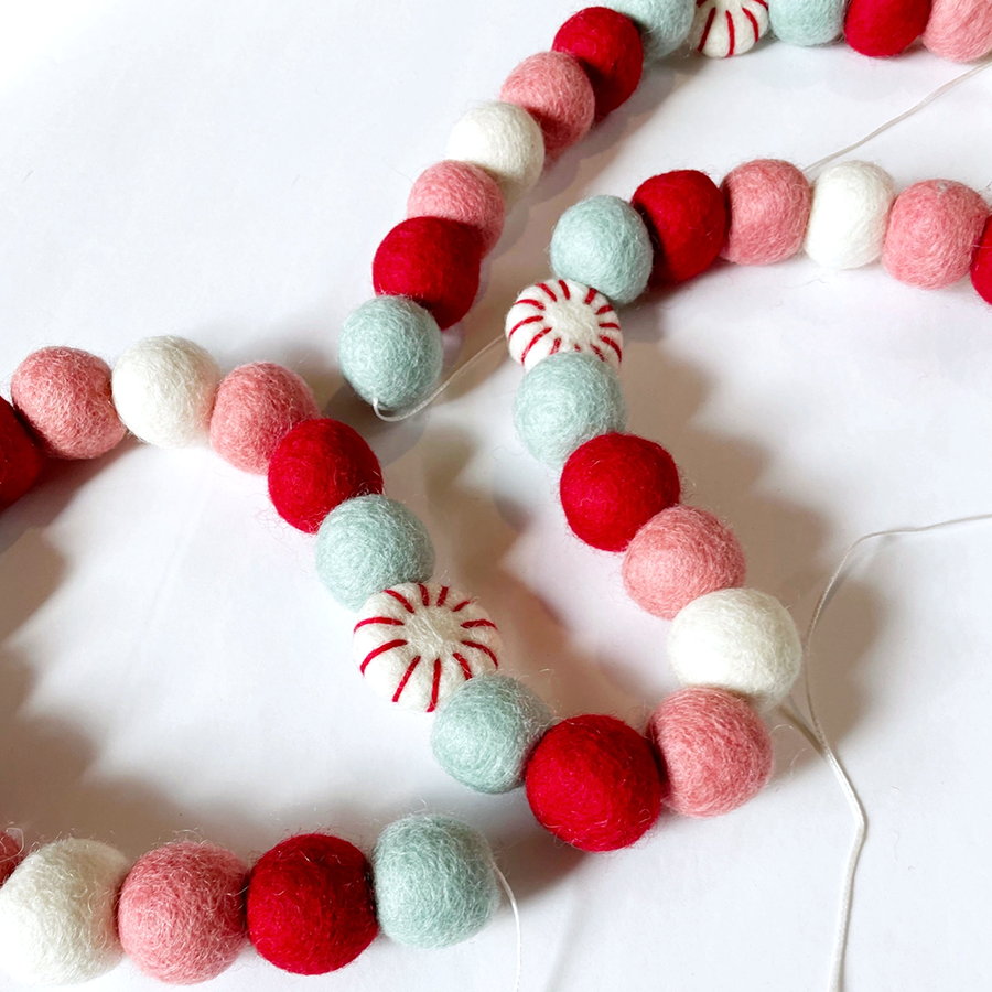 felt ball garlands is made up of 47 1.5 inch felt balls. Balls measure 4 feet. It is strung on a length of 7 foot stain rope. If you like a more spaced out look, simple undo the slip stitch in the end ball and slide them to your desired spacing.
