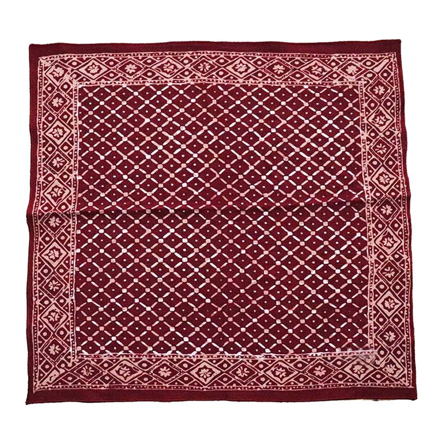 This lovely crimson red cross patterned scarf is made from white cotton fabric that is then hand-stamped and hand-dyed using 700 years old batik wax and dye technique. The batik fabric is also then sun baked. You should expect some variation of the color.